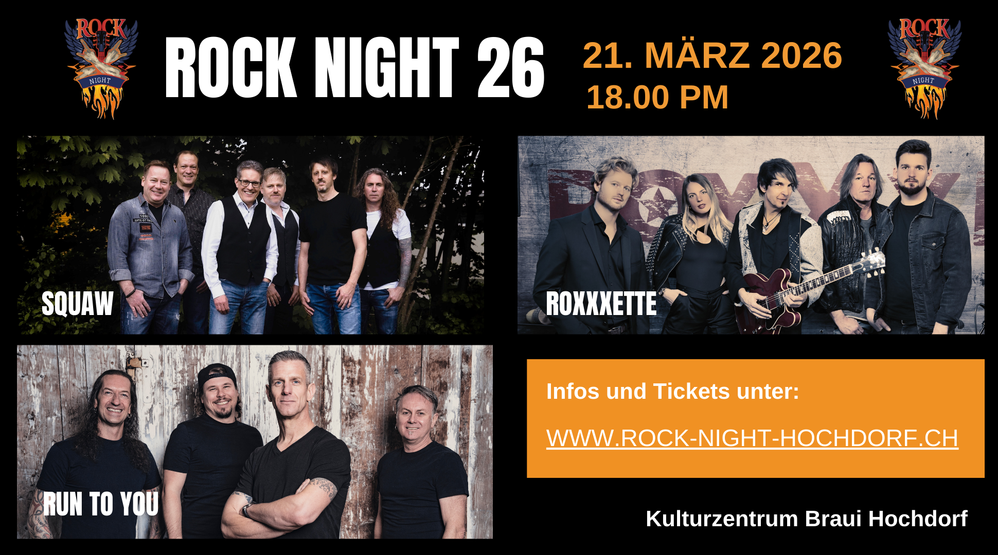 Nach den Erfolgen in den Jahren 2024 und 2025 geht es 2026 bereits in die 3. Ausgabe – mit Top-Publikum, Top-Stimmung und feinstem Rock-Sound. Das Line-up für 2026 wurde sorgfältig ausgewählt, damit garantiert jeder auf seine Kosten kommt. Wir sind stolz, Euch am 21. März 2026 gleich drei hochkarätige Live-Bands präsentieren zu dürfen: