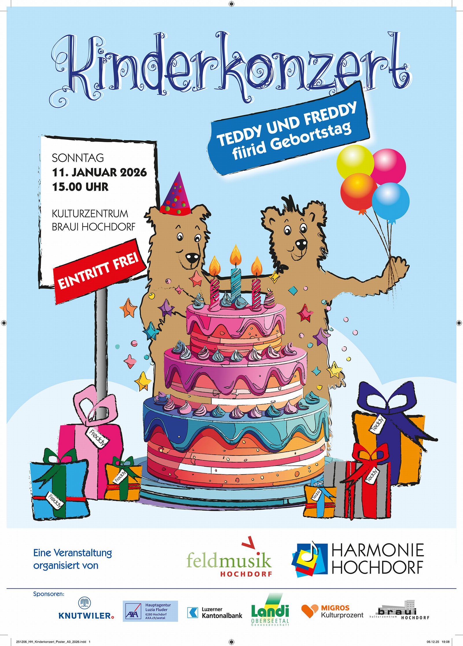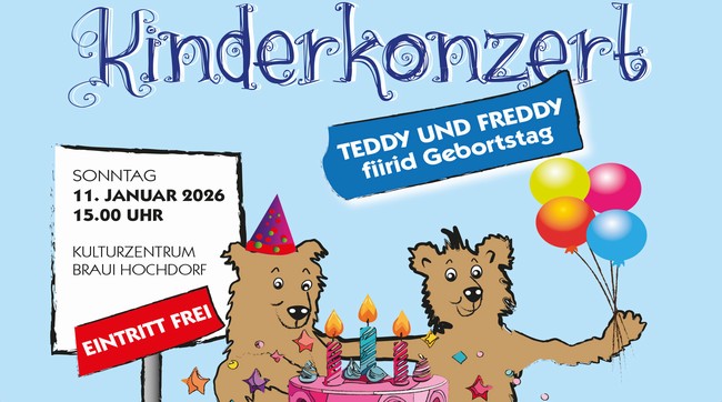 Am Sonntag, 11. Januar 2026, wird es im Kulturzentrum Braui Hochdorf besonders bunt und fröhlich: Die beiden beliebten Bären Teddy und Freddy feiern Geburtstag – und alle Kinder sind herzlich eingeladen, mitzufeiern!